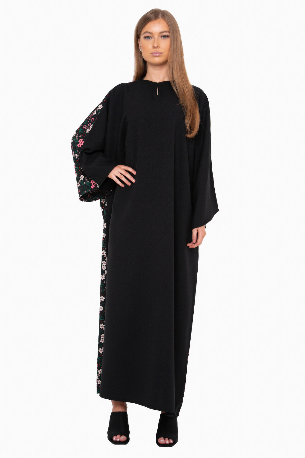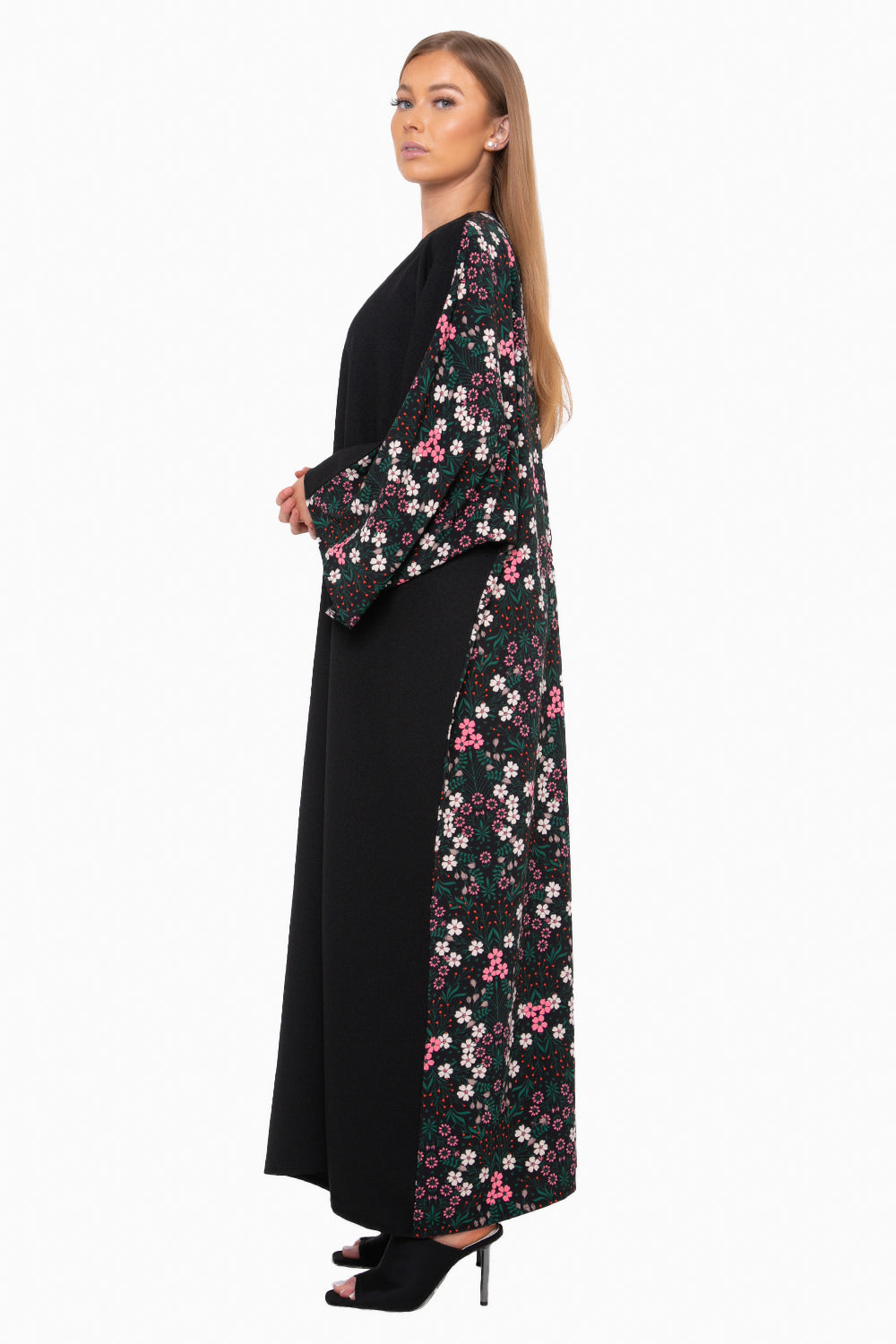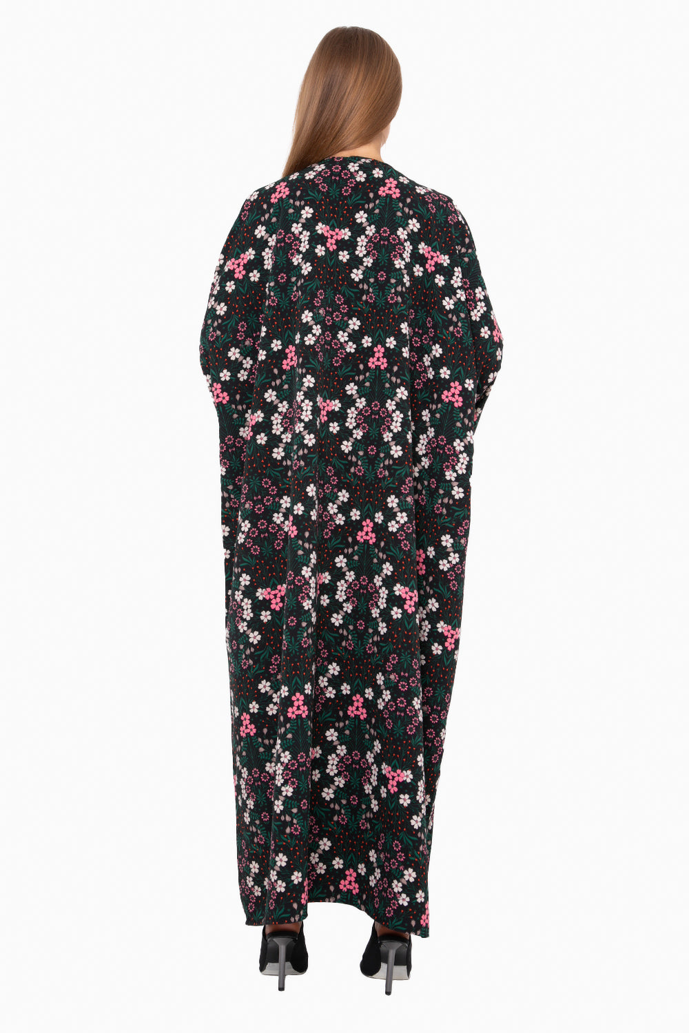 The oversized kaftan with a black front and floral print back, with full length sleeves.