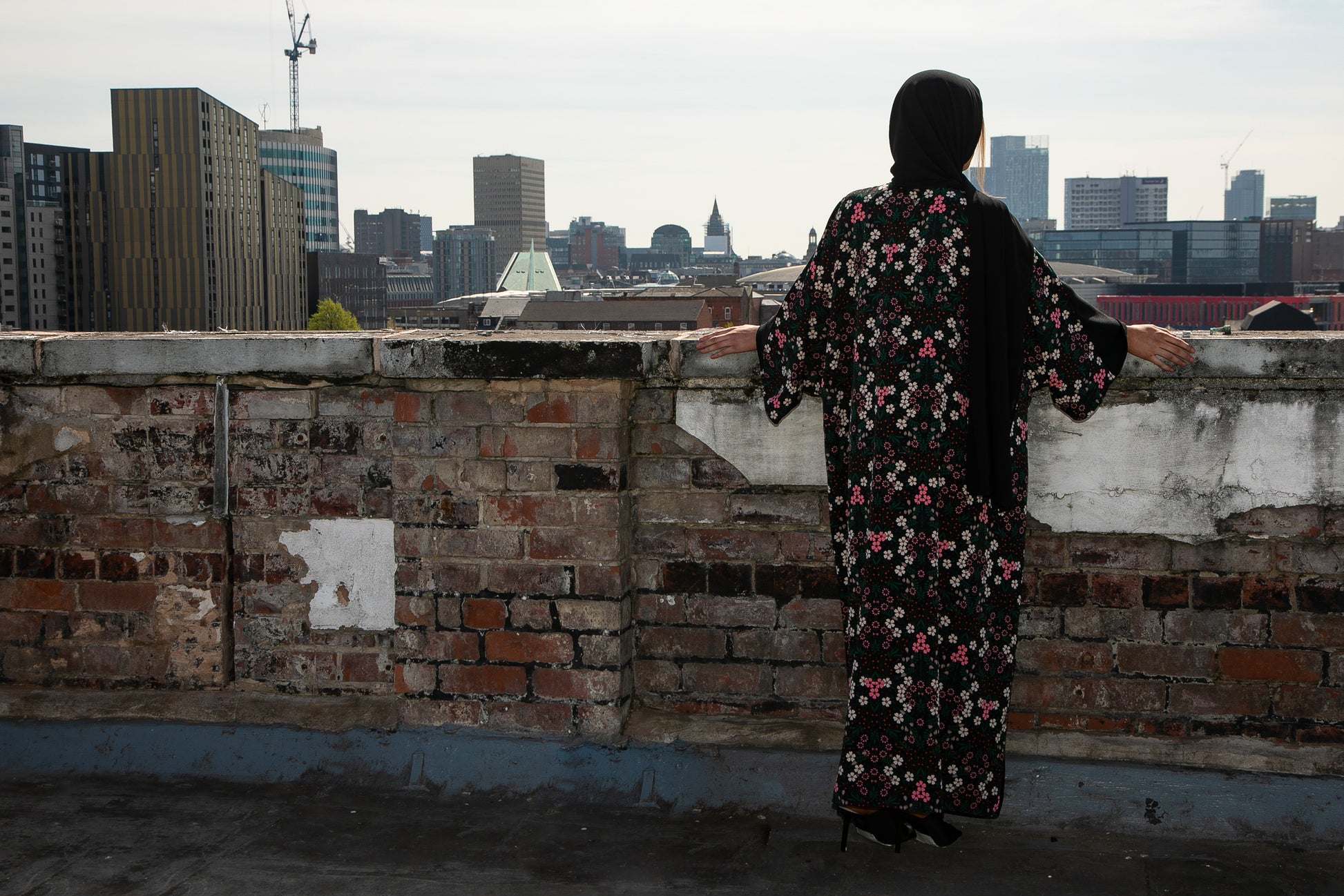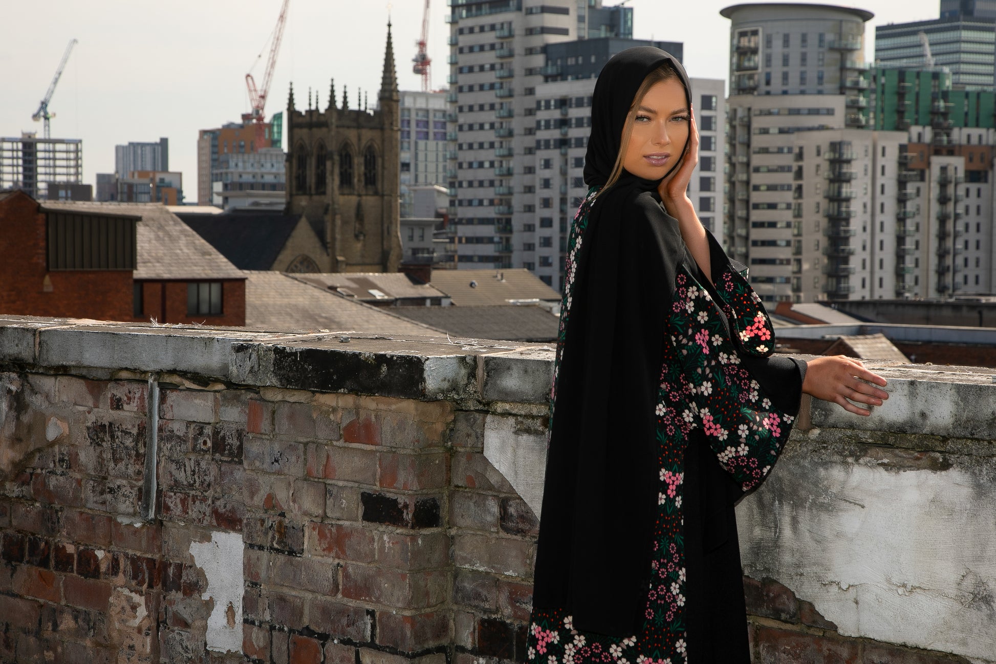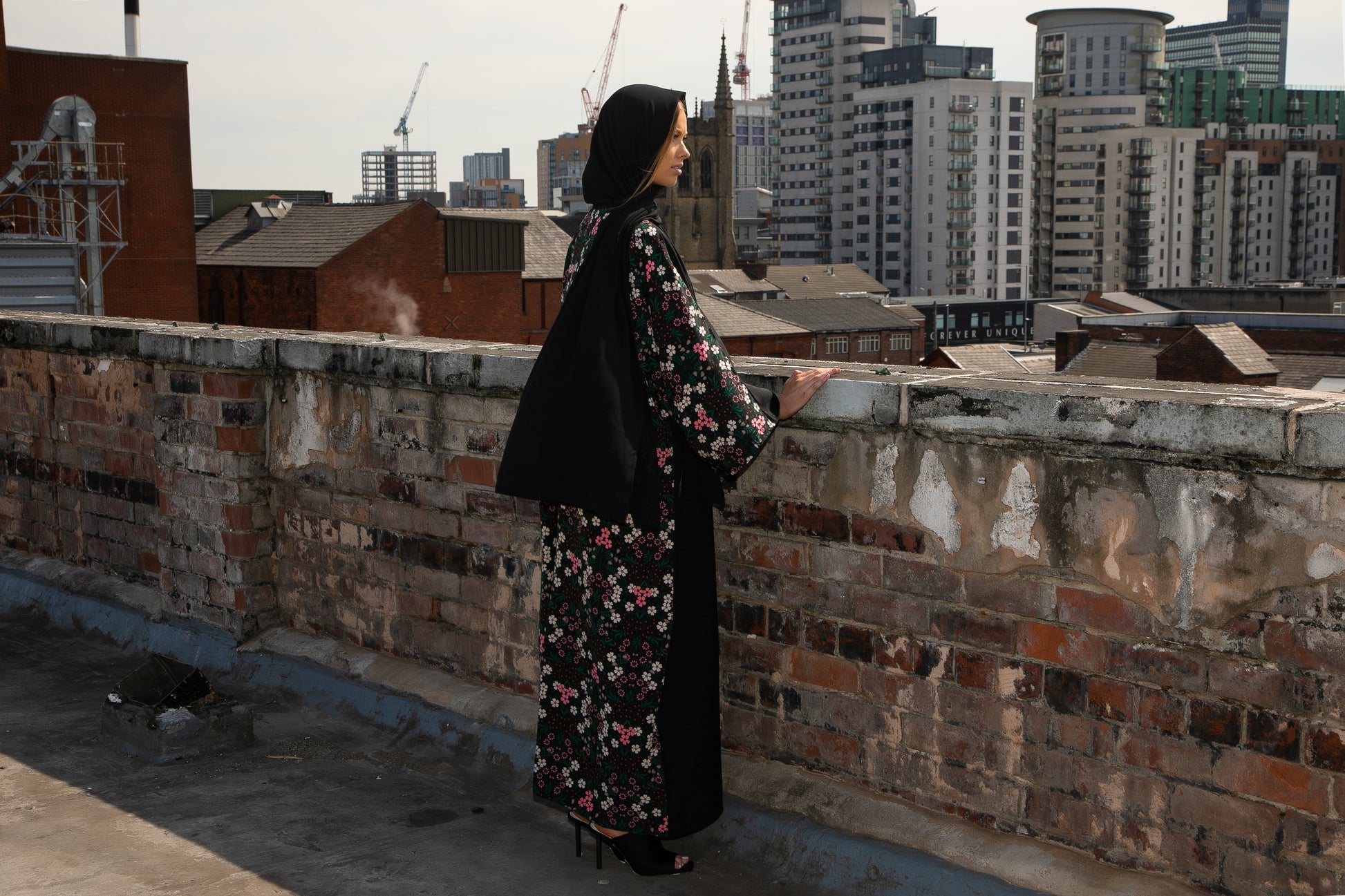 The oversized kaftan with a black front and floral print back, with full length sleeves.